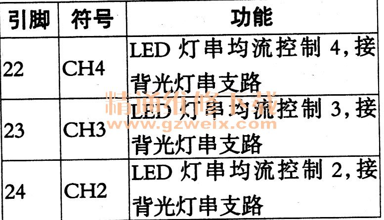 AP3068广泛用于LED显示器、液晶彩电背光灯驱动电路中,其典型应用电路如图2所示(本电路只采用了其恒流源电路),引脚功能见表3。