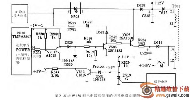 待机时,超级单片 N101 输出的“POWER”信号为高电平,V201 截止,发射极输出高电平,通过 D529 使三极管 V510 和 V505 均导通。V510 导通后,使 V508 截止,致使行小信号处理电路因无供电电压而停止工作。V505 导通后,集电极变为低电平,该低电平电压对开关电源高低压切换电路进行控制,开关电源输出电压大幅度下降,负载因供电过低而停止工作,进入待机状态。