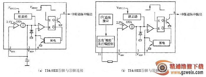 ②TDA48XX 的⑤脚(误差信号输入端)通过电阻与11脚左右“枕校”输出电路连接,如图 4(b)所示。这种接法当行输出电路停止工作时,TDA48XX⑤脚仍能从輯輥訛脚得到直流电压,+B 电源电路能够正常工作。