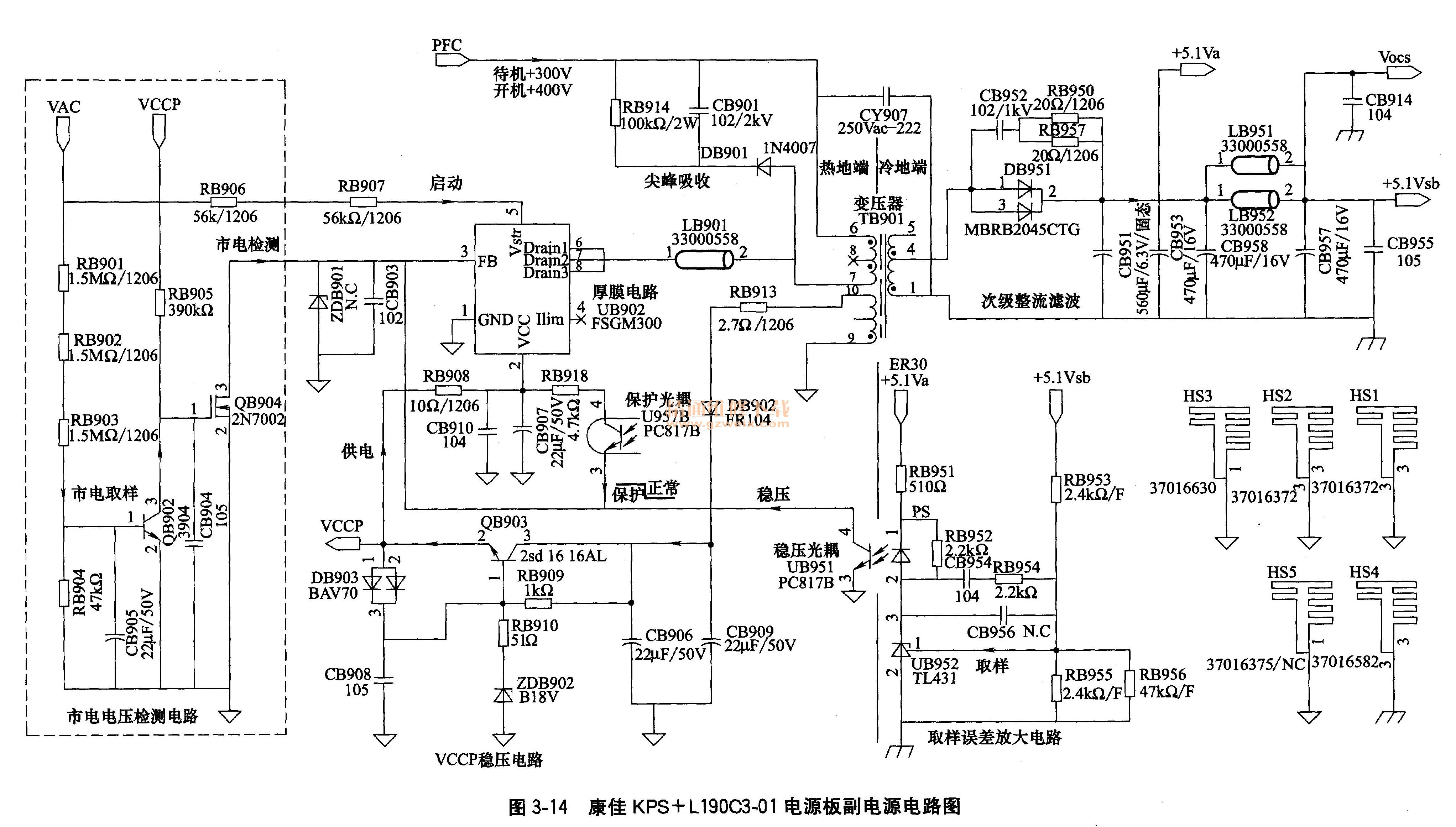 康佳KPS -E- L190C3-01型电源板中的副电源如图3-14所示。由厚膜电路FSGM300(UB902)、变压器TB901、稳压控制电路UB952(TL431)、光电耦合器UB951(PC817B)等元件组成,为整机控制系统电路提供待机和正常工作所需要的5.1VSB电压,同时产生VCCP电压,经开关机电路控制后,为PFC和主电源驱动电路提供工作电压。