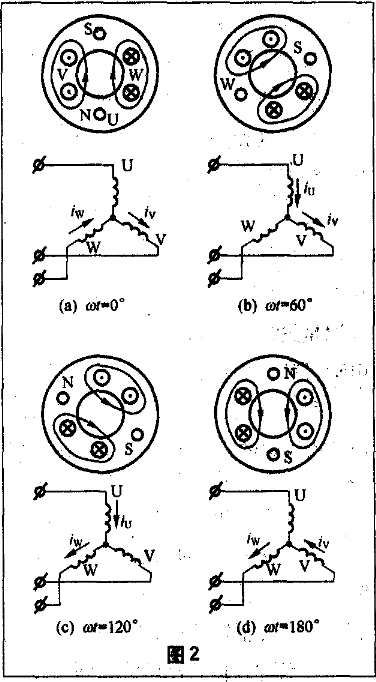 上述是两极旋转磁场,每相绕组即一个线圈,在空间位置互差120度。如果把线圈增加一倍,每相绕组由两个线圈组成,各线圈的始端(或末端)之间在定子内圆周上以互差60度的空间角度排列,并把两个沿轴线互差180度的两线圈串联成一相绕组,三相绕组连接成星形,如图3所示。当三相绕组通人三相正弦交流电时,便产生四极旋转磁场。若每相定子绕组由三个线圈串联组成,线圈在定子内圆周上以互差40度的空间角度排列,通入对称的三相交流电流时,就会得到六极旋转磁场。可见,适当布置定子绕组,便可得到具有不同个数磁极的旋转磁场。
