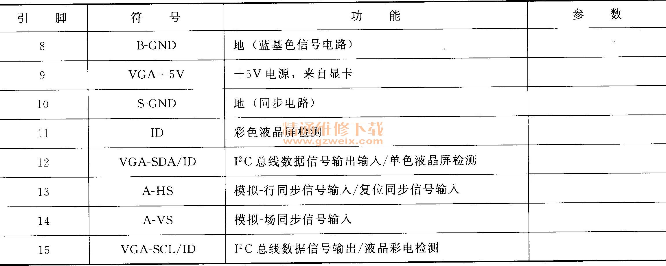 ① VGA, YPbPr, YCbCr接口简介图8-7是VGA接口,为3列15针,用于输入来自电脑的下列模拟形式信号:RGB红绿蓝三色信号、H-SYNC行同步信号、V-SYNC场同步信号、ID液晶屏识别信号。VGA接口引脚功能见表8-2。