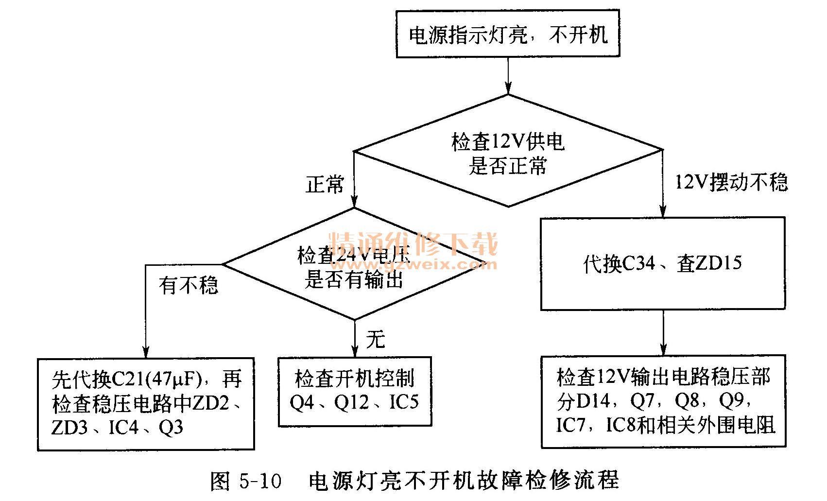 程,图5-10是电源灯亮不开机故障检修流程。