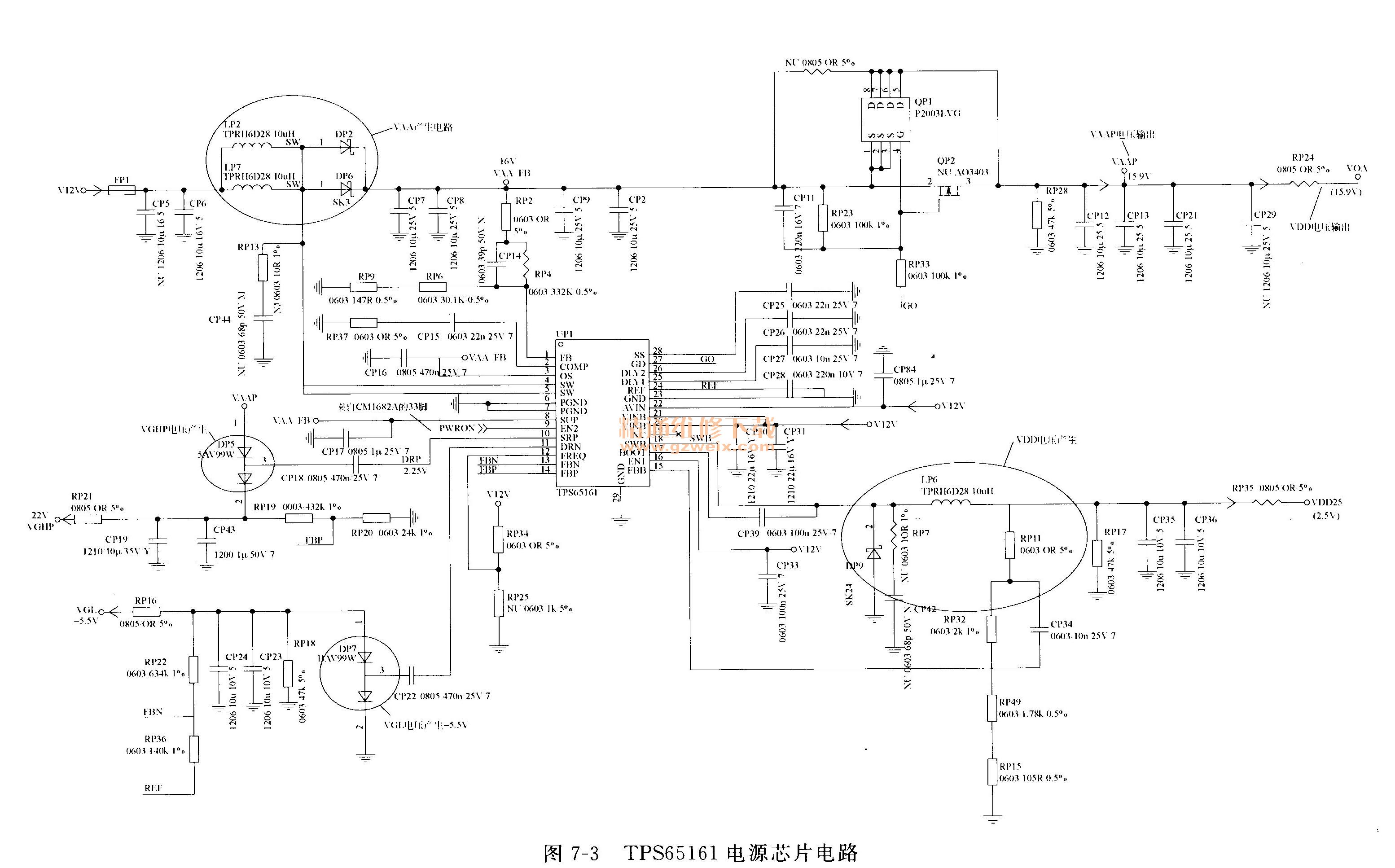 b. VDD2 5电压产生。由TPS65161的15~18脚电压组成。TPS65161工作后,在16脚输入12V电源时,则授权内部的降压转换器工作,由17脚输出N沟道MOs管驱动脉冲,通过CP3 9耦合,LP6, CP3 5积分,DP9稳压,形成2. 5 V电压,作为VDD25电源。
