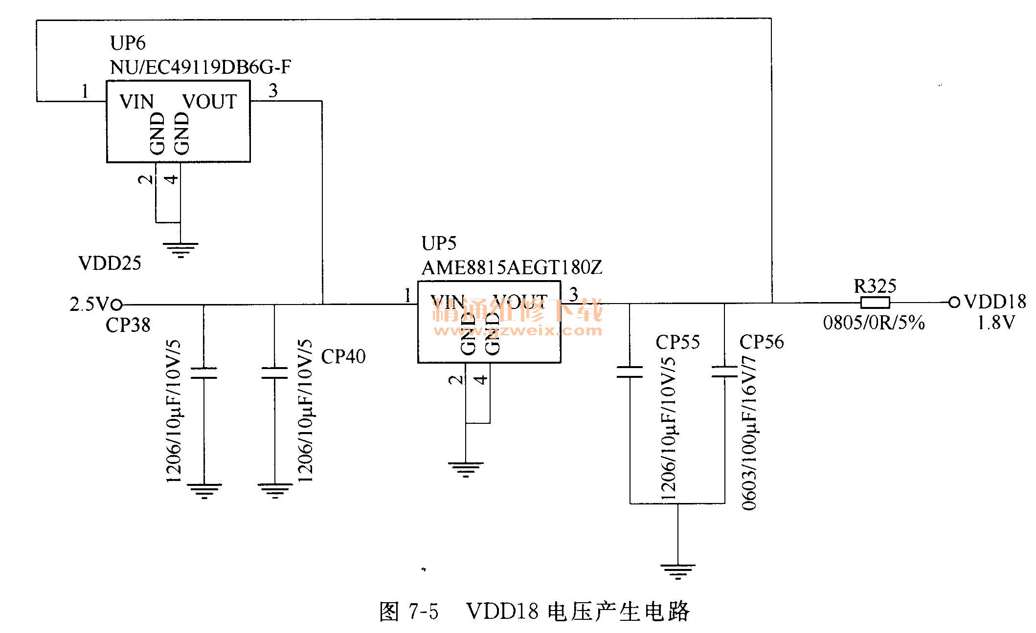 ③ VDD18产生电路图7-5是VDD18电压产生电路。由UP6, UPS三端稳压器对VDD25电源稳压形成1. 8V,作为、IDD18电源,提供给数字电路。UPS AME8815AEGT180Z是1. 5ACMOs低压稳压器,1脚是电源输入端,2脚接地,3脚是稳压输出端。
