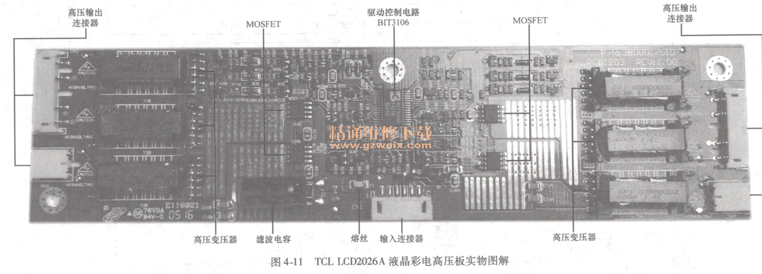 TCL LCD2026和LCD2026 A液晶彩电的背光灯高压板有两种,一种型号为INV40211V1. 00,配V201V1-TOI显示屏,应用于LCD2026A液晶彩电中,其实物图解如图4-10所示;另一种型号为3BDO017510,应用于LCD2026液晶彩电中,配LC201 VO2 (A3) (KB)液晶屏,如图4-11所示。两种高压板的驱动控制电路均采用BIT3106,其工作原理基本相同,只是元器件布局和输出连接器有所不同,可更改连接器插头后代换使用。本节以第一种应用于LCD2026A液晶彩电的INV40211高压板为例,介绍其工作原理与故障维修。