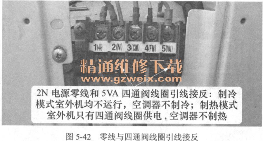 ③零线与四通阀线圈接反:如图5-42所示,制冷模式开机空调器不制冷,室外机不运行;制热模式开机空调器不制热。
