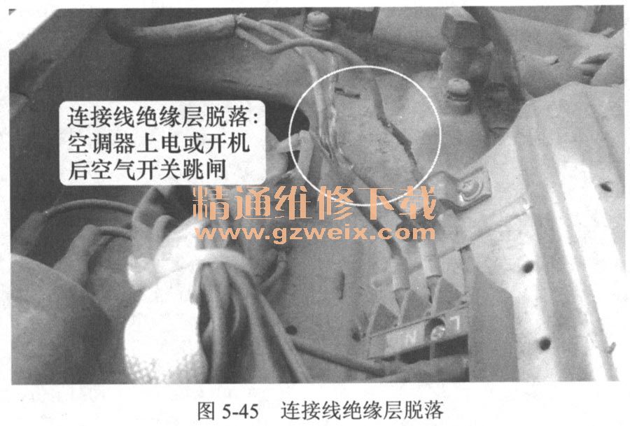 ⑥连接线绝缘层脱落:如图5-45所示,如果连接线质量不好(包括某些品牌空调器原装连接线),经过风吹日晒几年之后绝缘层脱落,引起上电或开机后空气开关跳闸的故障现象。