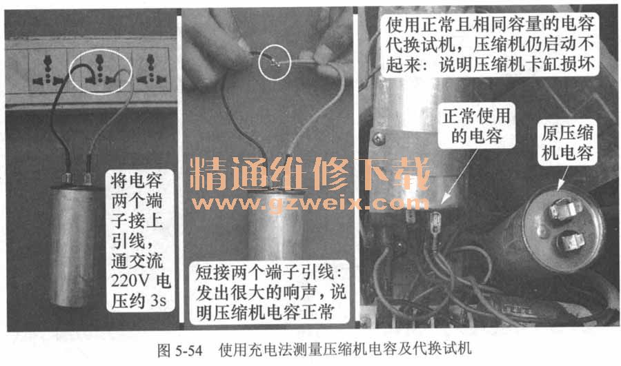 如图5-54所示,取下压缩机电容,在两个端子上接上引线并用交流220V充电约3s,拔出引线短接两个端子,正常时有很响的声音,实际短接时也有很响的声音,说明压缩机电容正常。试使用一个正常的电容代换,上电试机压缩机仍启动不起来,说明压缩机内部卡缸(即内部机械部分锈在一起)损坏。