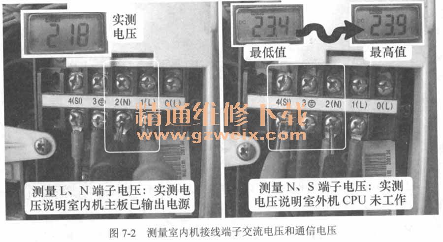 如图7-3左图所示,使用万用表交流电压挡,测量室外机接线端子中的1号和2号端子电压,实测结果为交流220V,说明室内机主板输出的供电已送至室外机。