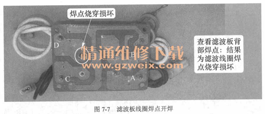 ①将滤波板重新开孔,并舌,1净表面绝缘层,再将滤波线圈引线表面刮净,并穿入新开的滤波板焊孔,使用烙铁将焊点焊好即可。