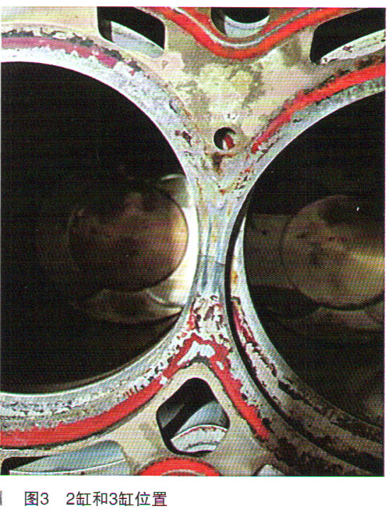 根据以上现象,可以确定车辆确实高温过。通过检查分析应该是发动机内部有异常,需要先拆发动机缸盖检查。将发动机拆下来拆掉缸盖,发现缸盖垫子2缸和3杠之间有一道裂痕,如图3所示。对发动机缸盖和缸体进行平面度和圆度测量无异常,更换发动机缸盖垫后交车,客户跑了一个多月反馈再没出现高温报警现象。