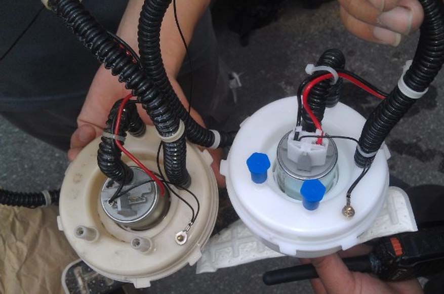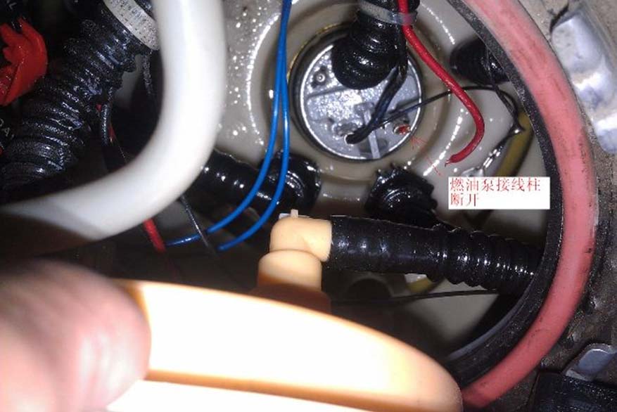 使用ISID诊断故障存储:481B04 燃油泵控制调节电流,缺失 ,首先使用了压力表测量了燃油系统压力为0BAR,然后在发动机启动时测量了燃油泵处电压为11.5V,可是没有听到燃油泵工作的声音。拆下燃油泵的检查口发现燃油泵正极接线柱断开。