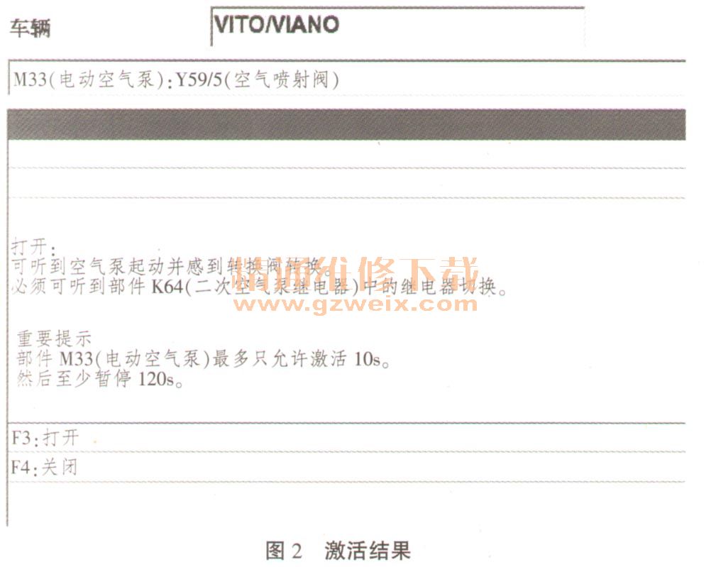 故障检测:执行故障码的引导诊断,用DAS激活M33(如图2所示),结果无法听到空气泵工作声音,不正常。