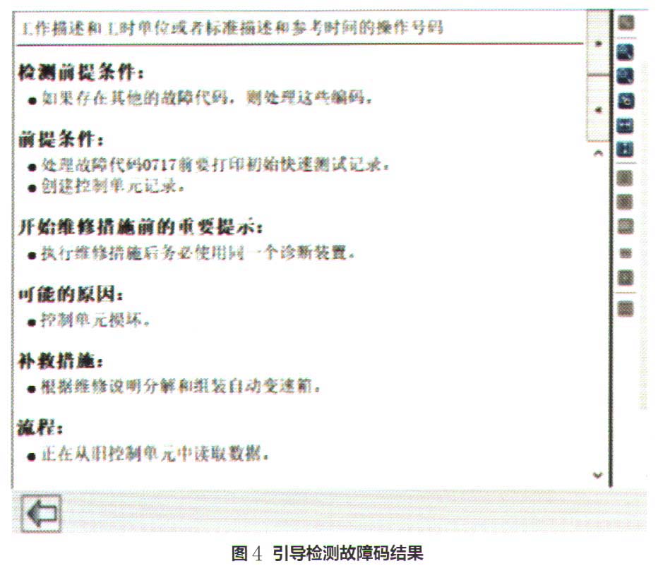检查分析:维修人员启动发动机,仪表中的发动机故障灯点亮报警(图1)。进行换挡操作,有明显的顿挫现象,踩加速踏板车辆无法移动。查询维修记录,该车在4万多km时更换过变速器电控液压单元。使用诊断仪XENTRY检测,发动机控制单元无故障码,变速器控制单元记录有“0717—涡轮’转速传感器信号缺失”故障码(图2)。对故障码进行引导检测(图3、图4)。