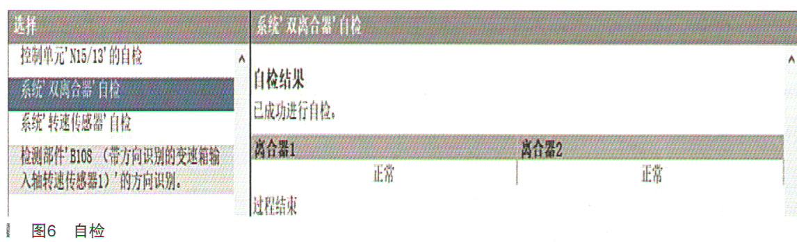 在成功进行复位部件“双离合器”的示教过程和离合器接合点适配后,进行系统“双离合器”自检,结果“正常”,如图6所示。