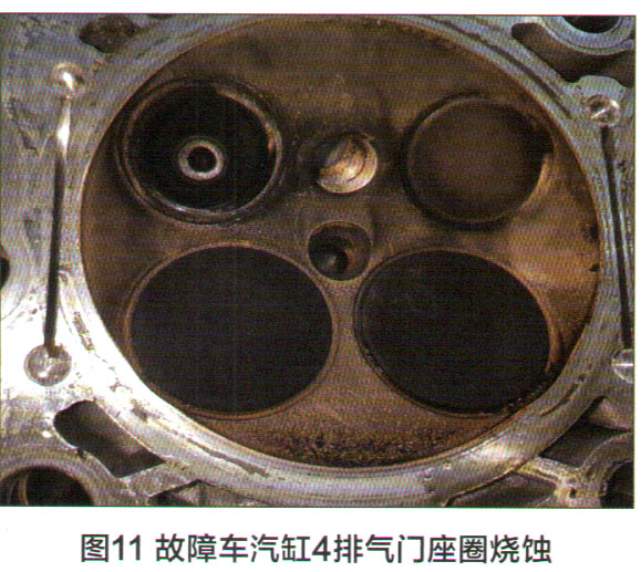 结合内窥镜检查的缸内情况,怀疑是气门密封不严而导致燃烧室无法完全密封,从而引起缺缸。拆卸汽缸盖进一步检查气门和汽缸盖,发现气门存在烧蚀情况,气门座圈及气门导轨出现磨损。经检查为汽缸4靠后的排气门存在泄露,气门座圈存在烧蚀痕迹(图11),测试其他气门的密封性,也不正常。活塞表面未发现异常磨损。