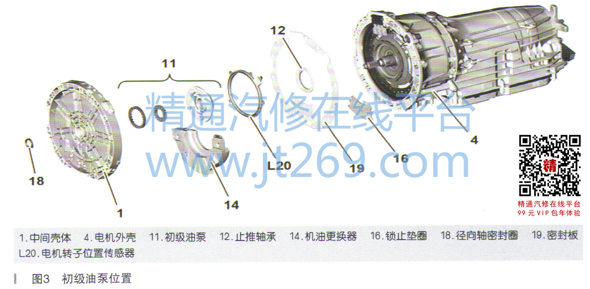 发动机正在运转时,初级油泵将变速器油输送至电控液压控制式自动变速器。初级油泵由湿式离合器驱动轴驱动。初级油泵安装在湿式离合器上游的变速器钟状外壳中,中间壳体后面,如图3所示。