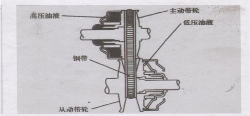 CVT只有两个皮带轮:主动皮带轮和从动皮带轮,主动带轮和从动带轮通过钢带连接在一起,为获得各种不同的传动比,带轮有效直径将随受到的液压压力以及钢带作用与活动带轮面上的力而变化。