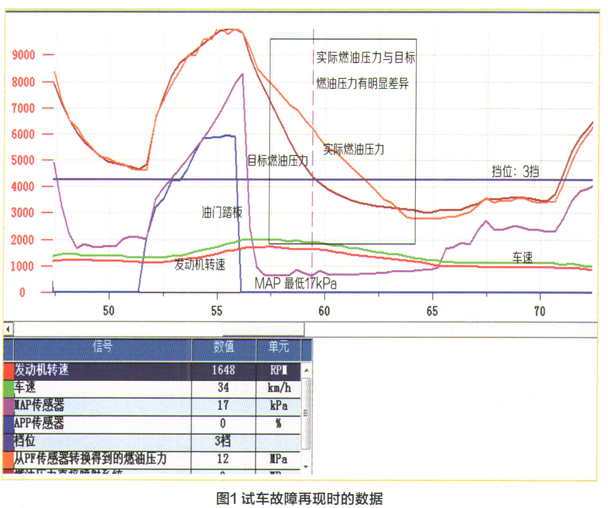 通过与正常车辆的数据进行对比,可以看出目标燃油压力和实际燃油压力在油门踏板快速、反复操作的情况下,会存在短暂的不重合,但很快就调整至基本一致的情况,不会出现与故障车辆类似的目标燃油压力与实际燃油压力偏差较大的情况。同时对比正常车辆,在30km/h的速度下,用3挡收油减速,正常车辆MAP值比故障车辆要大,且正常车辆在滑行时MAP最低为24kPa,而故障车辆MAP最低为17kPa。暂不明确MAP是否与燃油压力出现偏差有关联。