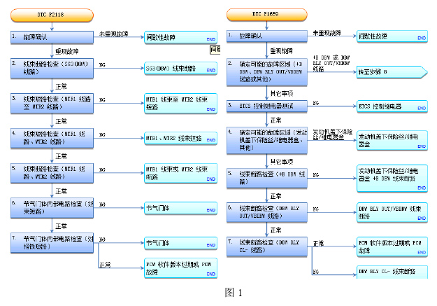 4、然后解决P2118节气门执行器电流范围性问题。综合电路原理图(见图3)及故障诊断树(见 图1)进行故障排除:先后检查了节气门体4号针脚与ECM/PCMC43号针脚的是否导通,通过节气门体上的5, 6号针脚间阻值判断作动器是否正常,检查节气门体上的5, 6号针脚的对地是否短路,发现一切正常。