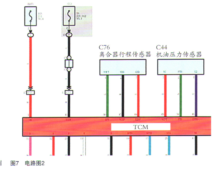 (6)通过电路图(如图7所示)查询到TCM有两个供电电源,一个搭铁线:于是首先测量供电保险,测量仪表板内部接线盒