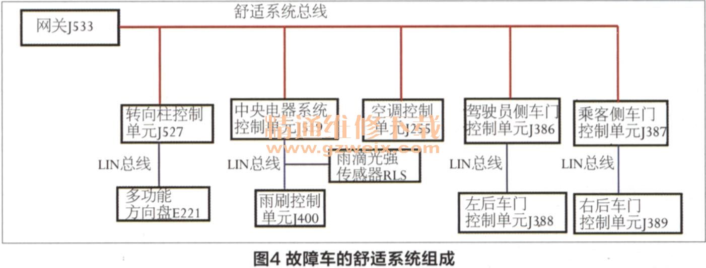 此车的舒适系统由中央电器系统控制单元J519、转向柱控制单元J527、雨刷控制单元J400、雨滴光强传感器RLS、多功能方向盘控制单元E221,驾驶员侧车门控制单元J386、乘客侧车门控制单元J387,左后车门控制单元J388、右后车门控制单元J389、空调控制单元J255、网关控制单元J533等组成(图4)。