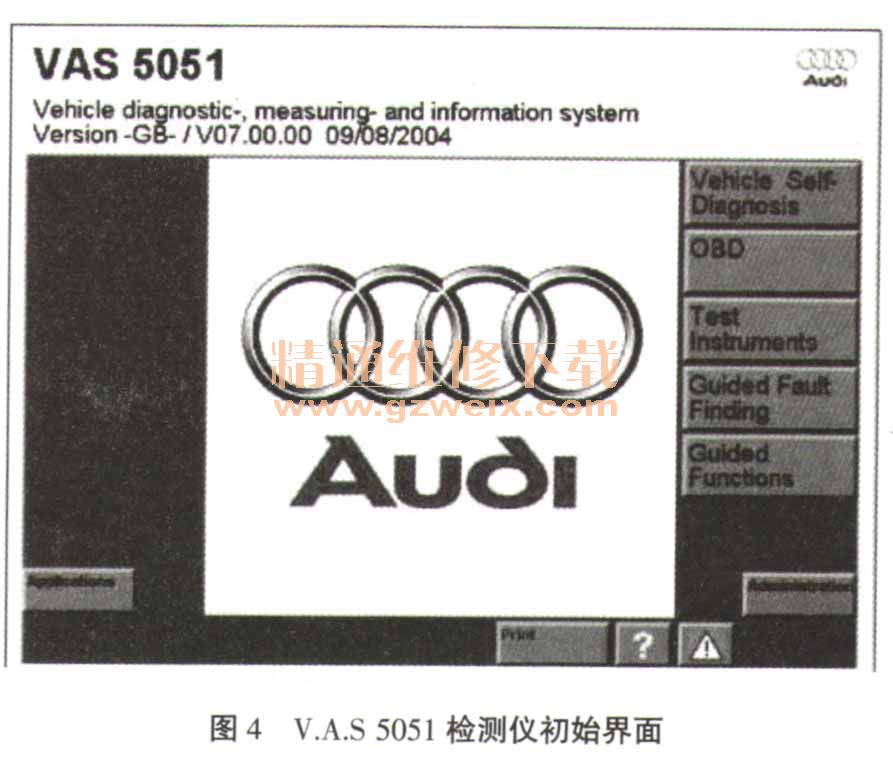 考虑到机油报警灯亮,用机油压力表检测机油压力,结果正常,于是更换了机油压力传感器,故障依旧。由于仪表盘上发动机转速表突然变为0,安全气囊报警灯和机油报警灯同时点亮,故障现象集中在电控仪表盘上,考虑可能是电控仪表系统存在问题,决定更换1个仪表盘试验。更换后,做好与发动机控制单元的匹配,试验,怠速运行正常,路试过程中依然偶尔出现上述故障现象,故障依旧。更换了安全气囊电脑,故障依旧,至此排除过程陷入了困境。为了分析故障原因,运用V.A.S 5051检测仪进行分析,进入“引导性故障查寻”功 能。如图4、图5所示。