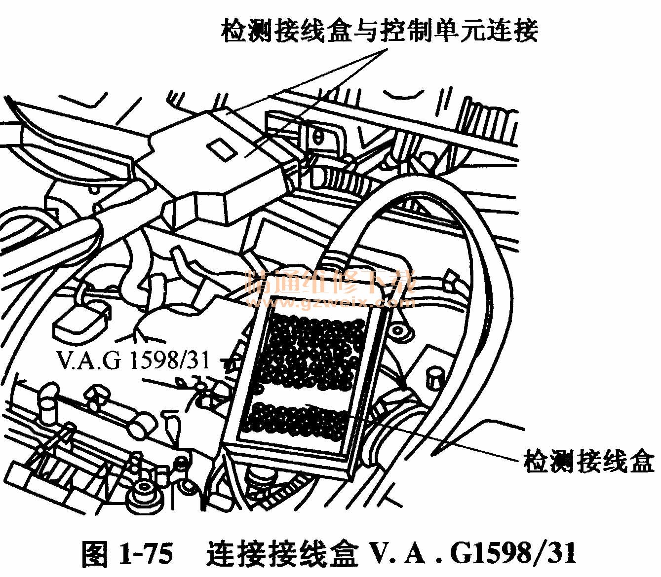(3)拔下控制单元(J248)插头,连接检测接线盒V. A.G1598/31(图1-75)。检测接线盒插口和油量调节器插头端子的对应关系为:插口1和插口2对应端子5、插口121和插口126对应端子6。
