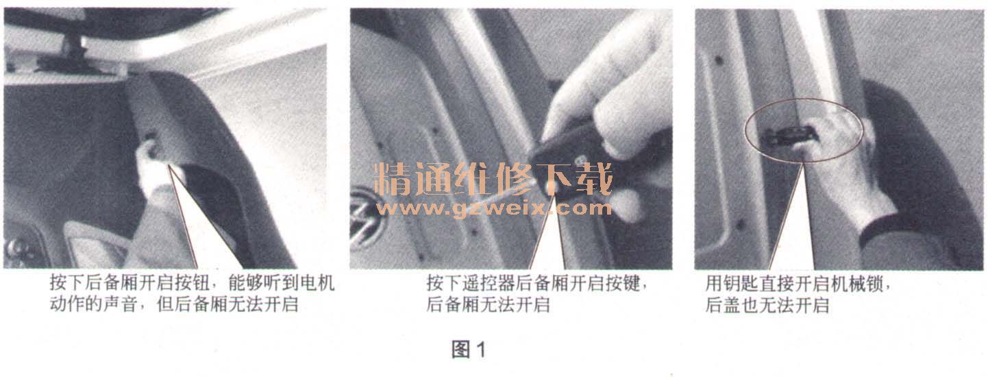 (1)现场试车,下面三种开启方法都无法打开后备厢,如图1所示。