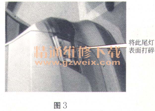 ①用锤子将右侧后盖尾灯表面打碎,如图3所示。