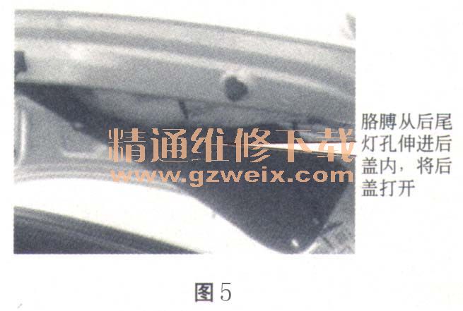 ③将胳膊从后尾灯孔伸进后盖内,将后备厢盖饰稼的卡扣扣出,可能会将后备厢盖饰板损坏,用手接触到后盖锁环,将后盖打开衬如图5所示;