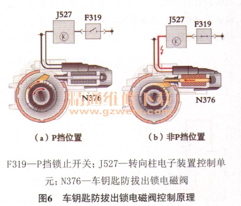 查看维修资料得知,J527通过接收P挡锁止开关 (F319)信号来控制车钥匙防拔出锁电磁阀(N376),如图6所示,当换挡杆处于P挡时,允许拔出车钥匙;当换挡杆处于非P挡时,不允许拔出车钥匙。J743根据换挡杆位置(由换挡杆位置传感器监测,换挡杆位置传感器的位置如图7所示)、制动开关、车速等信息来确定锁止或释放换挡杆锁;锁止和释放换挡杆信息通过驱动CAN总线传递给换挡控制单元(E313),E313通过控制换挡杆锁电磁阀(N110)来锁止或释放换挡杆。如图8所示,在P挡和N挡时的换挡杆锁止形式有所区别,换挡杆只要处于P挡,如果没有制动信号,N110就会断电,换挡杆锁止,而当换挡杆处于N挡时,如果停留时间超过2s且车辆静止,N110则通电,换挡杆锁止。