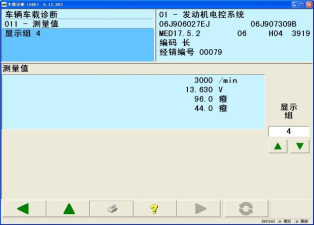 3. 在发动机怠速情况下读取测量值 4 发现电压为 12.1V; 将油门踩至 3000 转后读取测量值此时电压为 13.6V.如图可知发动机转速超过 2000 转后发电机自励磁正常发电,则发电机正常。