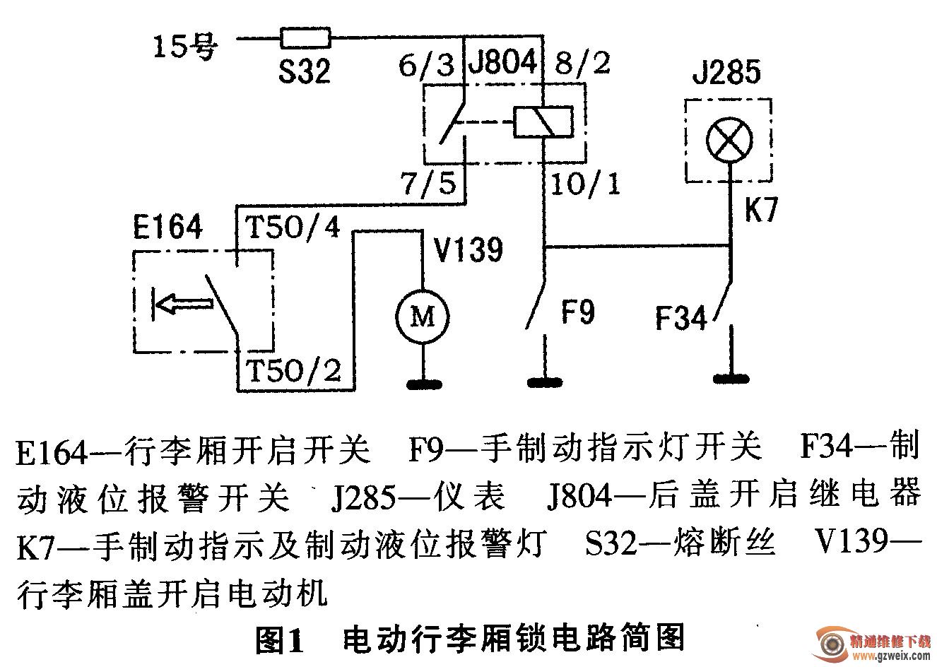 从图1中可以分析出后备厢开启工作原理为:①接通钥匙开关后,15号线通电,从而熔断丝S32通电。②手制动开关或制动液开关搭铁,手制动灯会亮。③同时,后备厢开启继电器J804工作,6/3与7/5经触点连接,7/5连接E164的T50/4插头。④操作行李厢开启开关E1649 T50/2与T50/4插头接合,电流传到行李厢开启电动机V139,使后备厢打开。