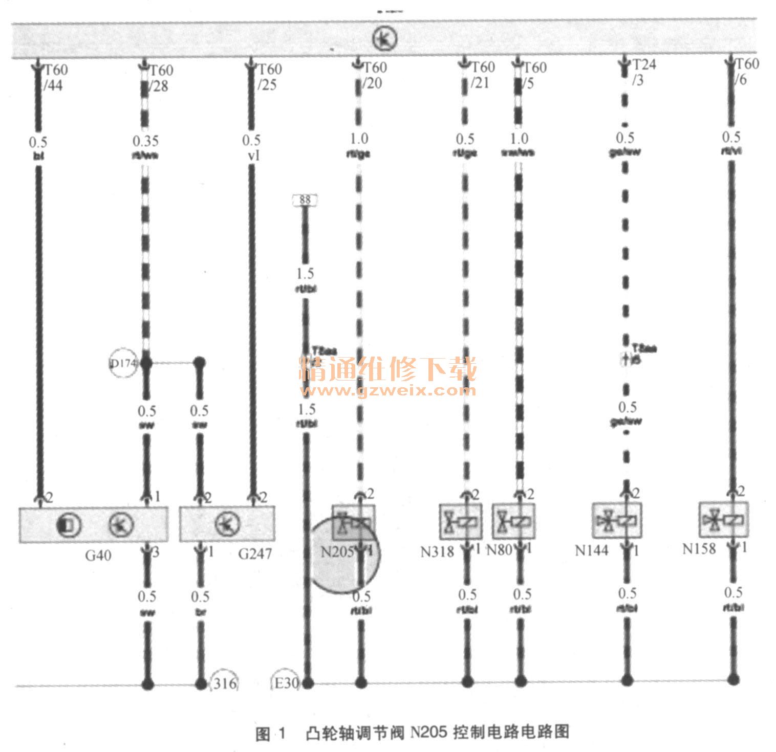 接车后:笔者进行检查,发现有故障码储存,故障码是P0011凸轮轴位置A汽缸列1正时过度提前,凸轮轴调节阀1 N205故障。根据故障现象,初步判断应该为线路故障,紧接着查找电路图(如图1所示)进行线路检测,没有发现断路和短路现象,电源正常。