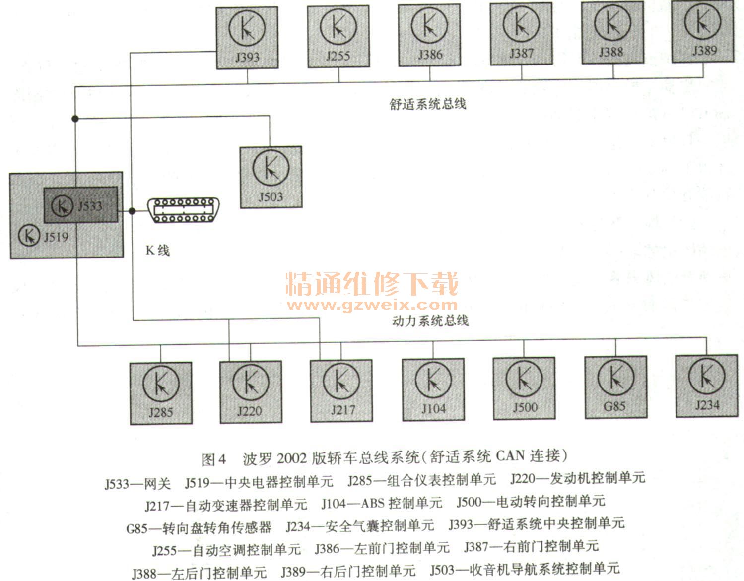 图4所示为波罗桥车总线系统,网关J533安装在中央电器控制单元J519中,诊断仪通过K线与网关J533、发动机控制单元J220、自动变速器控制单元J217、舒适系统中央控制单元J393通信。在CAN总线系统中,诊断仪通过CAN总线与网关J533通信(图4未画出),网关J533再通过CAN线与动力总线系统、舒适总线系统、信息娱乐总线系统通信。为安全可靠起见,诊断仪K线通信仅保留发动机和自动变速器控制单元。