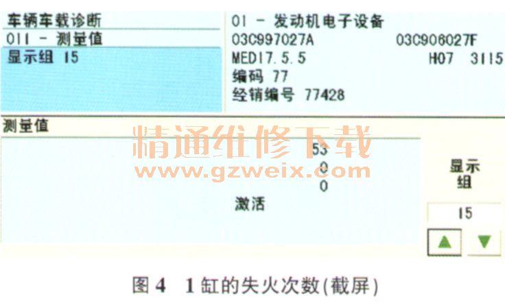 根据上述故障现象及故障代码的提示,决定首先对1缸的点火情况进行检查。为了快速诊断故障原因。维修人员从库房领取了火花塞和1缸的点火线圈,更换后试车,故障依然存在。用VAS5054读取相关数据流,发现1缸的失火次数为53次(图4),说明问题应该与点火系统无关。
