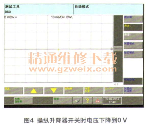 接下来检查升降器开关E107的波形是否正常,将检测线连接到升降器开关的1号针脚(图2),该针脚用于升降器上升的信号。在不操纵升降器开关的情况下,检测到该针脚的电压约为12V(图3);操纵升降器开关时,发现此处电压下降到0V(图4)。经过检测升降器开关的波形,确认升降器开关、开关到J387的线束连接正常。经过以上检查确认升降器开关正常、J387的供电、搭铁及lin线均正常。