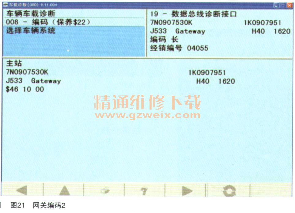 11.对19网关进行更改编码,手动更改及在线编码后,编码结果和正常车相同,但故障依旧,如图20、图21所示。