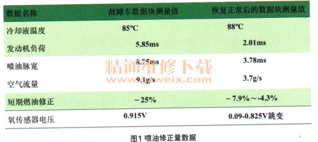 检查分析:维修人员用V.A.G1552故障诊断仪检测发动机控制单元J220,无故障码。发动机怠速运转时查看数据流,发现喷油修正量过大,而且空气流量数值偏高(图1)。断开空气流量计G70的插接器,发动机抖动停止,空气流量数据变成4.1 g/s,由此可以确定空气流量计有故障。