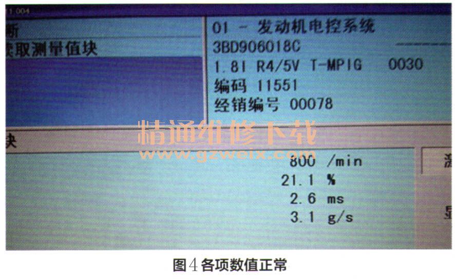 将中冷器下部的进气管重新连接,降下车辆再次读取002组数据,如图4所示,转速800r/min,发动机负荷21.1%、喷油时间2.6ms,进气量3.1 g /s,各项数值均在正常范围内。装上发动机下护板,路试,故障排除。