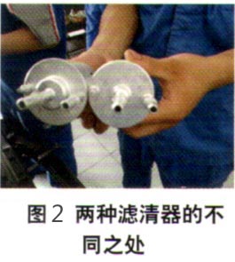 经用户同意后,更换了燃油泵。可是结果令人失望,响声丝毫没有减弱。用听诊器听,还是燃油泵的声音。恰好在这个时候有一辆同款车来做保养,对比燃油泵的声音,那辆车就小得多。仔细观察发现,那辆车的燃油滤清器与故障车的不一样,在进油口处没有一个圆形凸起(图1)。