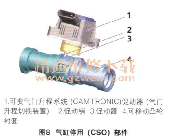 对于进气凸轮轴和排气凸轮轴,通过可以轴向移动的凸轮衬套,使2个气缸的不同凸轮行程进行切换。CSO工作时,切换至“零升程,,凸轮,滚子摇臂在此位置通过360°基圆运行且气门保持关闭。第2个升程位置是常规的“全升程”凸轮,工作情况与普通发动机类似。