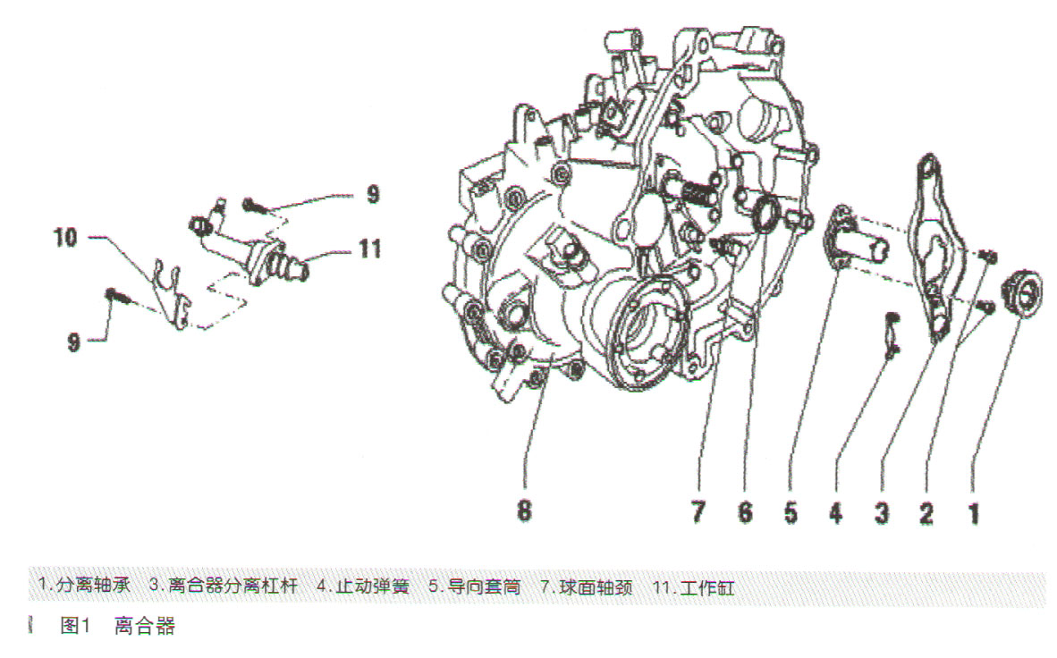 套筒、工作缸、离合器压盘等相部件,如图1所示,更换后当时异响能够消失,但是行驶一段时间后异响再现。