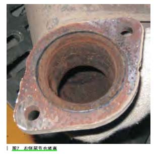 于是,笔者借来试驾车互换排气系统,当拆卸下排气管尾节后,发现有大量的杂质已经将尾节堵塞得严严实实了(如图6、图7所示)。更换排气管尾节后,再次试车,故障彻底消失。