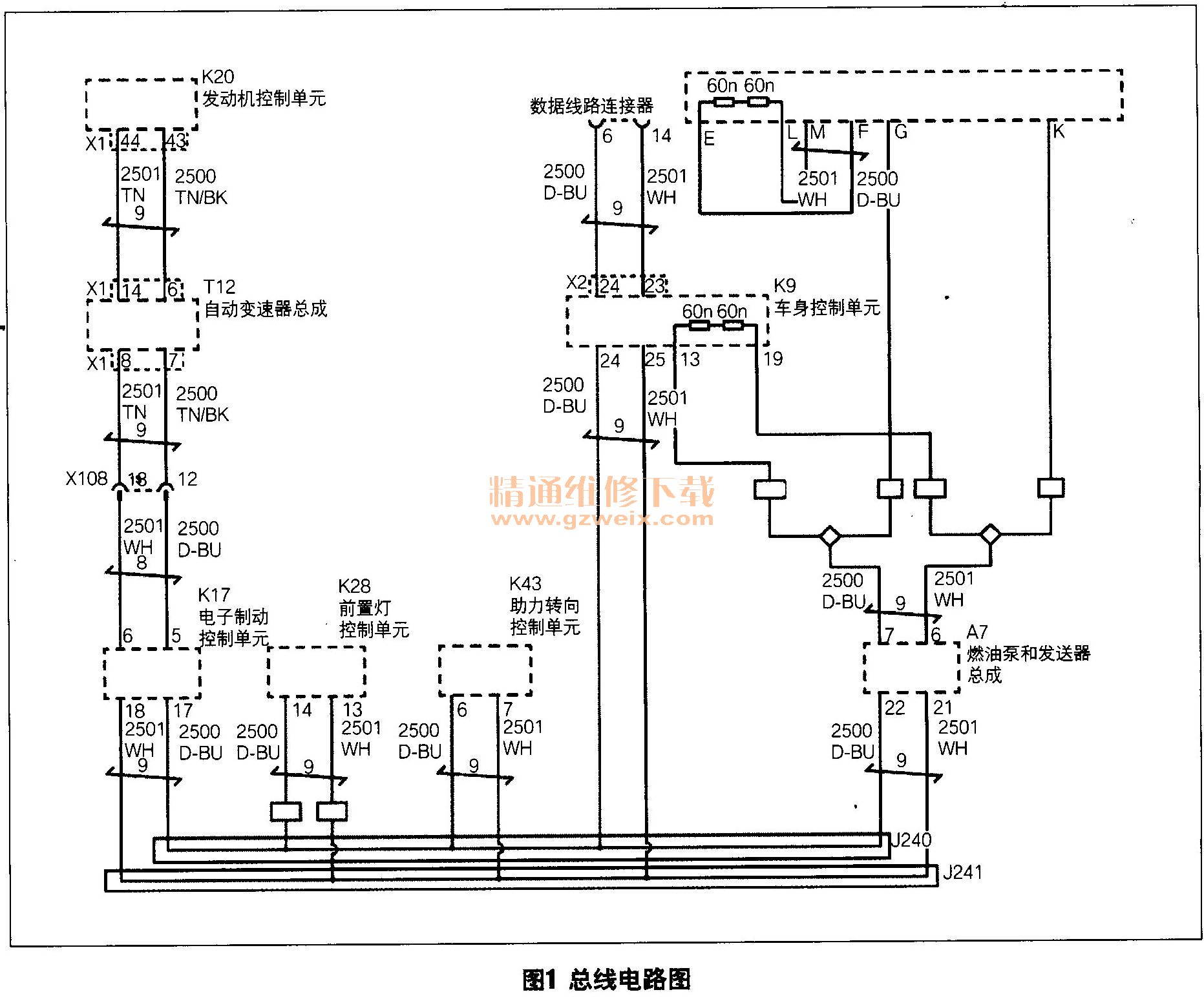 测量插接器 X108的12、13号脚动力系统一侧的电压,仍然都是7V,说明问题的确出在这一区域。根据电路图,X108的12、13号脚与变速器控制单元插接器X1的7、8号脚相连。断开变速器控制单元,按照该控制单元的电路图(图2),测量插接器X1的7、8、6和14号脚的电压值,发现14号脚的电压为12V,完全不对。为了验证是线路问题还是发动机控制单元的数据线驱动器与电源短路,将发动机控制单元断开,再测量14号脚的电压,此时为0V,说明异常电压来自发动机控制单元。