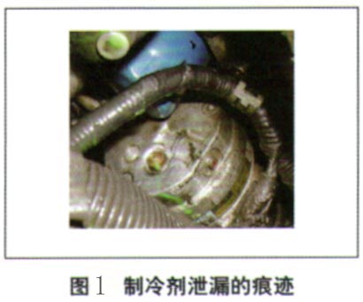 检查分析:维修人员检查发现,该车压缩机内的制冷剂已从安全阀全部喷出,油液飞溅四处(图1)。