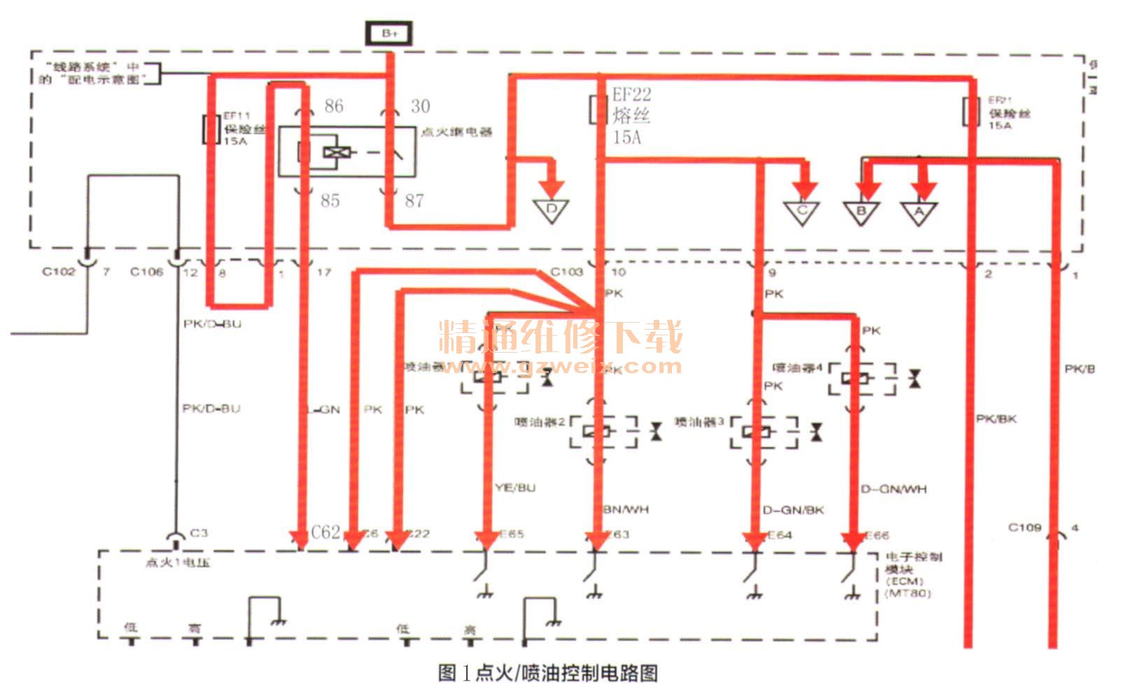 故障诊断:接车后确认故障现象与客户保修内容一致。对车辆点火和喷油系统进行测试,启动车辆发动机不点火、不喷油。查阅相关电路图(图1),检查EF22熔丝,正常,没有熔断,打开点火开关,EF22熔丝没有供电。