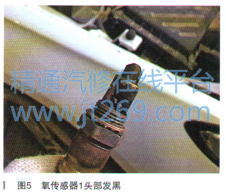 氧传感器1头部发黑,如图5所示,充分证明混合气确实偏浓。